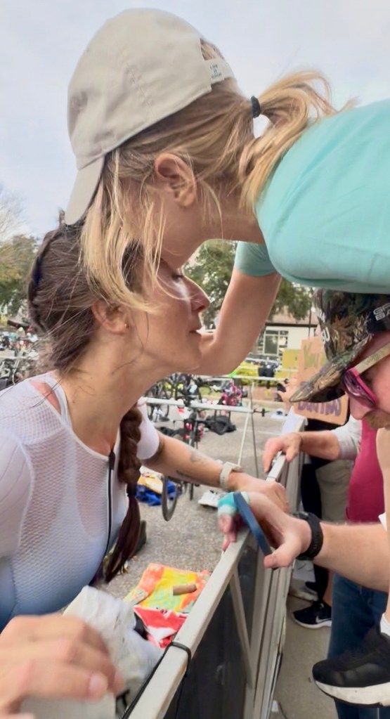 I knew at this second that I’d hit it, and it was really really emotional. They told me I’d need 10:22/mile and I knew I could do that even if I walked a bit. I got another surprise as I made my way back onto the course and saw Shannon, Claire, Linzie, and Vanessa. I totally wasn’t expecting to see them and it was such a joy to get greeted back out onto the course with their feral screaming.
