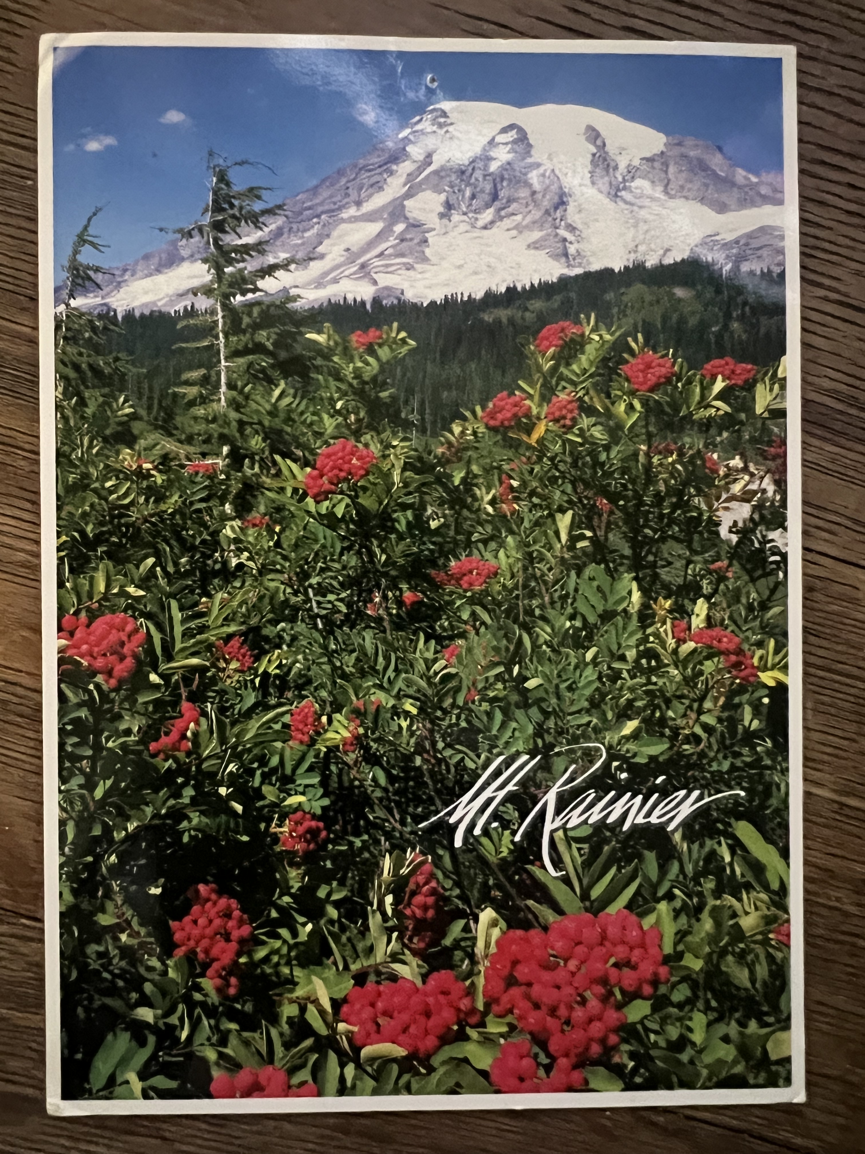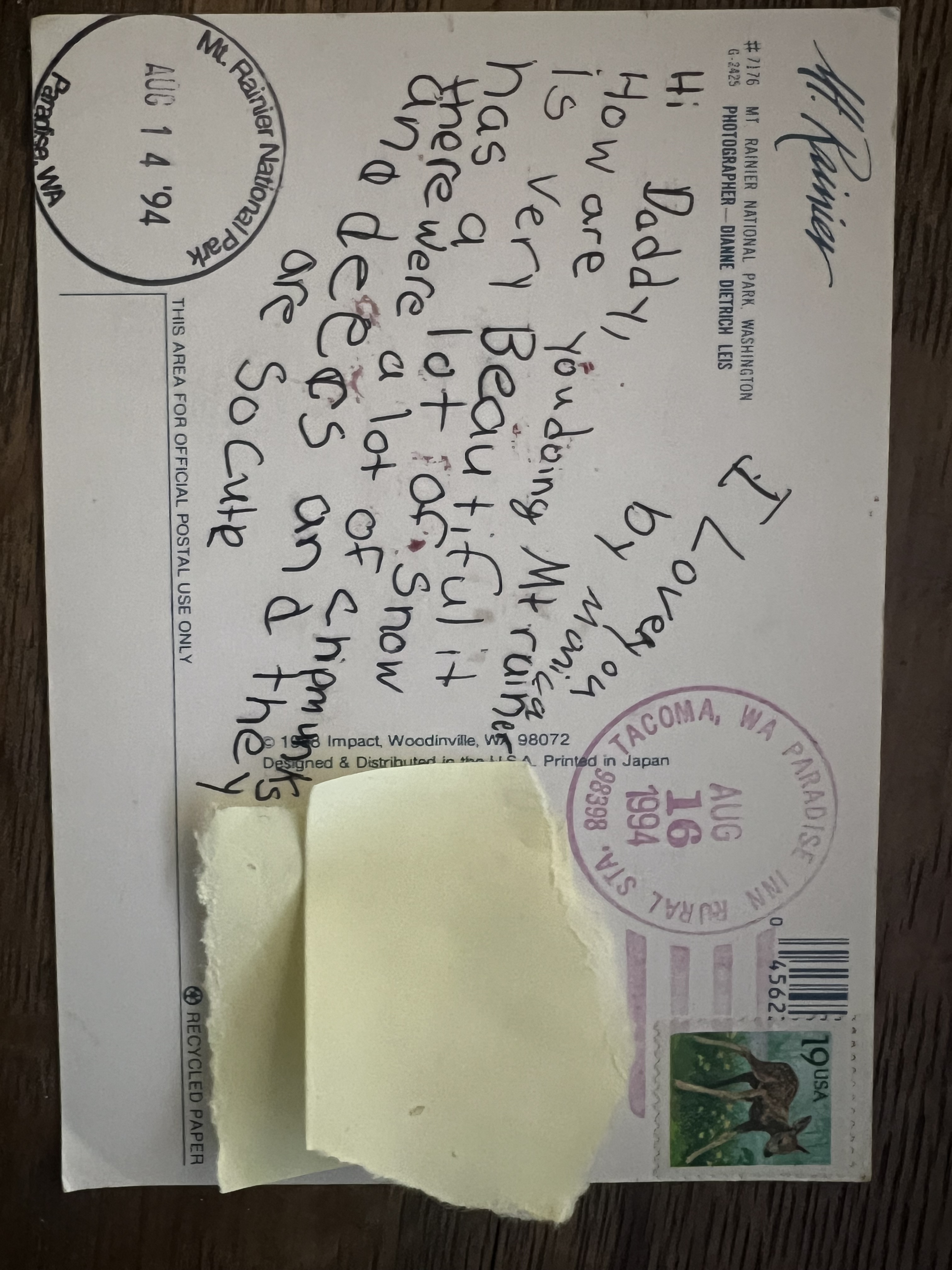 Before we loaded into the van to start our trek, our International Mountain Guides (IMG) guides had us go around and share our “why”. Rainier feels like a strange pull for a girl at sea level, and I can’t pinpoint the exact moment it turned from a quiet curiosity (a picture on my vision board) to a full blown obsession (I was never good at operating in the grey). Maybe it started with the postcard I wrote to my dad in 1994, the one my mom found tucked away in a box last year: