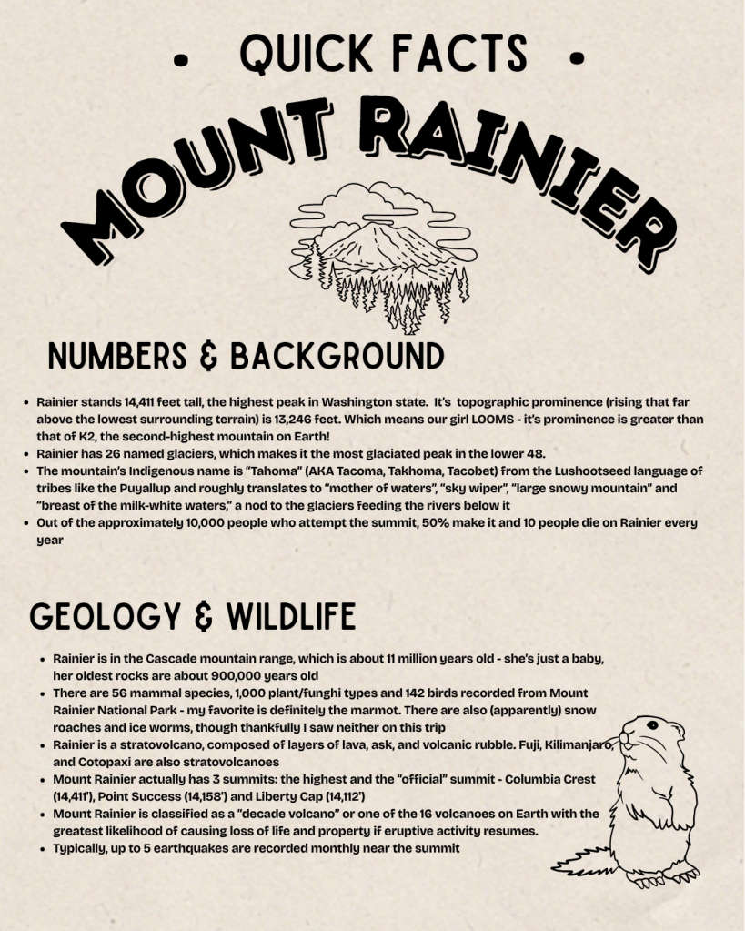 Mount Rainier stands at 14,411 feet and is the most glaciated peak in the lower 48. It’s also a stratovolcano – Sloane makes sure I don’t forget that part and reprimands me when I call it a mountain. I did a deep dive into the history and geology and pulled together some stats that I found interesting below