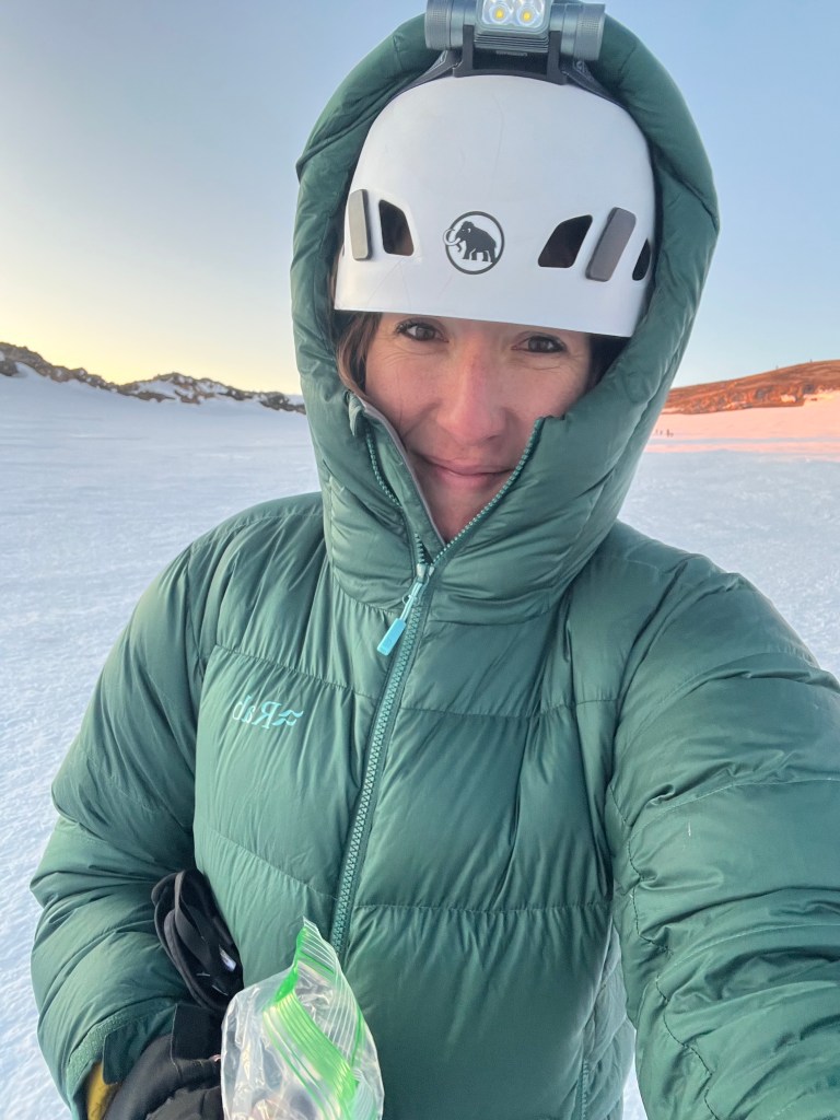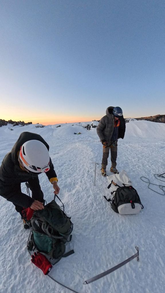 After we ate, we had “the talk”. Shannon and I anticipated this, as we had a very scary and stern one before Baker. The talk was basically a rundown of logisitics and expectations on summit day. Lindsay, our lead guide, took point on outlining everything that we’d be doing in the next 12 hours. We’d set alarms for 10 p.m as a wake up with a strict 11:30 pm start. That sounds like a lot of time but it’s not – we’d have to pack up our tents, eat breakfast, don all of our climbing gear (helmet, boots, crampons, harness), use the ridge bathrooms if we needed to and have packs on to go at 11:30 (we ended up starting to move at 11:24). The early start is meant to avoid crowds on the mountain. We had four rope teams and wanted to keep everyone together. Plus, the terrain deteriorates with the sun, so an early push is ideal.