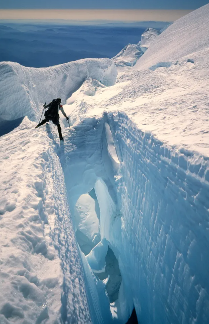 The next section was very steep and crevasse heavy in parts. We were about to cross a super narrow snow bridge over a giant crevasse, and I noticed that my headlamp flashed a few times and went dim – I could barely see. I cannot think of a worse time for a headlamp to kick the bucket and I panicked a bit. I think that was the diciest I felt through the whole climb for sure, but thankfully dawn would be breaking soon and I switched to my backup headlamp after the crossing.