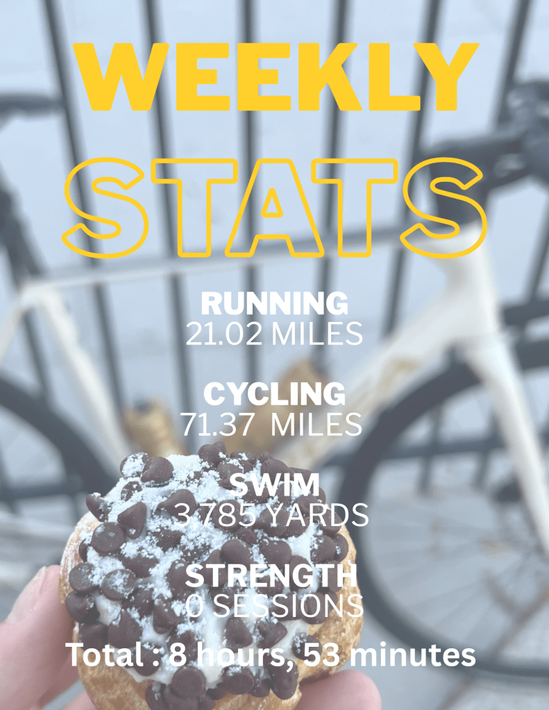 -Aside from some negative self talk around not getting in any lifts, I’ve really surrendered these past few weeks to the gray. I am letting go of a lot of the rigidity. I think triathlon training helps me be a bit more flexible because of all of the different modalities involved – I think with marathoning, I’m so fixated on a certain mileage for the week, but it feels less important here, at least for now.